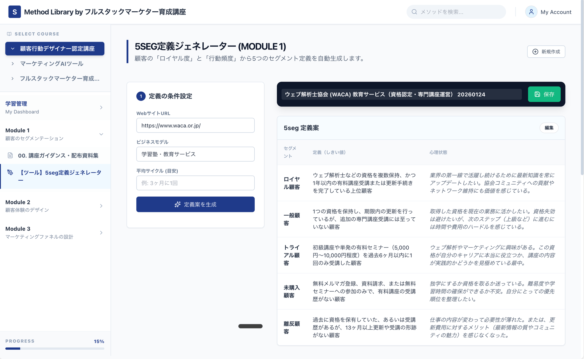 1.  Gemini最新モデル搭載の「独自AI」を完備 受講生限定で、Googleの最新モデル(Gemini 3.0等)を実装した「顧客行動デザインAI」を提供します。 私が培ってきた思考プロセスを学習済みのため、あなたの事業情報を入れるだけで、AIが「思考の速度」でペルソナ分析、ジャーニーマップ作成、インサイト特定をサポートします。
