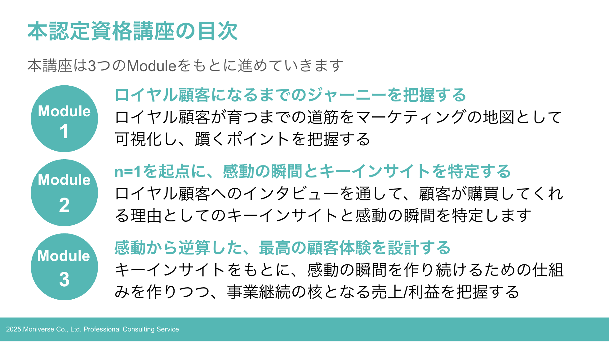 3つのModuleを通して「戦略(Macro) → インサイト(Micro) → 実装(Execution)」を独自開発のAIツールを使って一気通貫で習得頂けます。